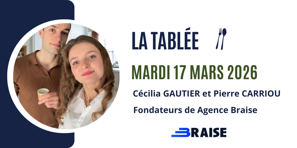 Pour la tablée du mardi 17 mars 2026, nous aurons le plaisir d’accueillir le binôme de filleuls Cécilia GAUTIER & Pierre CARRIOU, fondateurs de Agence Braise.